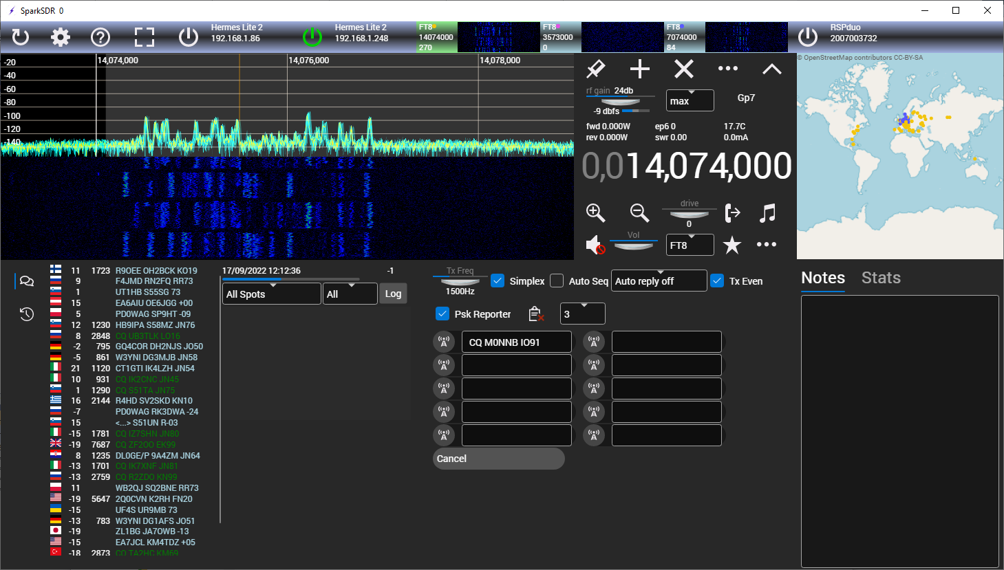 SparkSDR is software that connects to a number of SDR radios, these are typically small black boxes connected by Ethernet or usb. SparkSDR handles tuning and demodulation of signals and provides the user interface to control the radio. It can simply be used to listen to broadcast radio stations, transmit to others in a variety of modes or decode all sorts of digital transmissions. A key feature is the ability to tune into many signals at once. There are a number of digital modes used in the amateur radio world and these can be detected and automatically reported to PSKReporter (> 30 billion reports at time of writing!), it has become an unofficial challenge as to who can detect the most signals. Spark is well suited to this with some people tuning into 60+ frequencies and modes simultaneously and running 24/7.